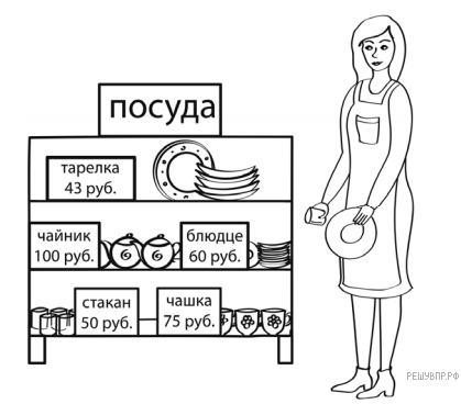 Рассмотри рисунок и ответь на вопрос: сколько рублей сдачи получит покупатель, расплатившийся за одну тарелку и один стакан купюрой в 100 руб.?